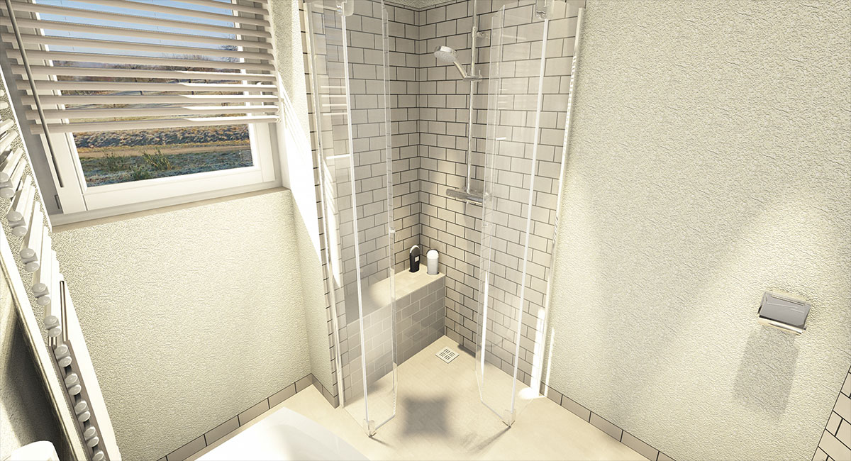 • Duschelement, 90 cm, 5-Eck, rollstuhlbefahrbar, Ablauf waagerecht